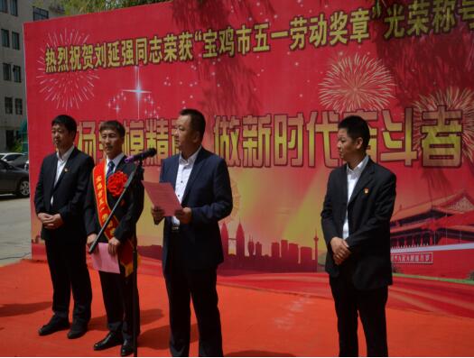 4月30日,寶雞市勞動(dòng)者之歌暨慶?!拔逡弧眹?guó)際勞動(dòng)節(jié)大會(huì)勝利召開,公司劉延強(qiáng)同志被授予“寶雞市五一勞動(dòng)獎(jiǎng)?wù)隆惫鈽s稱號(hào),公司在總部辦公樓前舉行了簡(jiǎn)樸隆重的歡迎儀式。公司副董事長(zhǎng)、總經(jīng)理胥立,黨委書記景旭東,工會(huì)主席王建成等出席儀式,總部全體、寶雞文化藝術(shù)中心項(xiàng)目部管理人員參加。