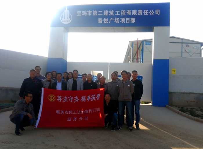 2018年10月10日下午,寶雞文理學(xué)院服務(wù)農(nóng)民工法治宣傳服務(wù)分隊(duì)來到公司吾悅廣場項(xiàng)目施工現(xiàn)場,舉辦了一場“尊法守法·攜手筑夢”法律知識(shí)公益講座。第三十項(xiàng)目部、第三十八項(xiàng)目部的三十余名現(xiàn)場施工人員參加了活動(dòng)。