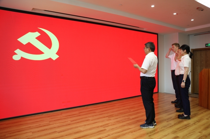 黨委副書記、監(jiān)事長沈?yàn)槊駧ьI(lǐng)預(yù)備黨員入黨宣誓;